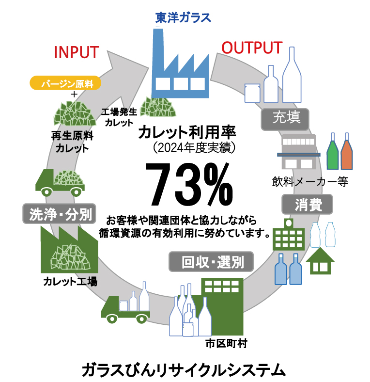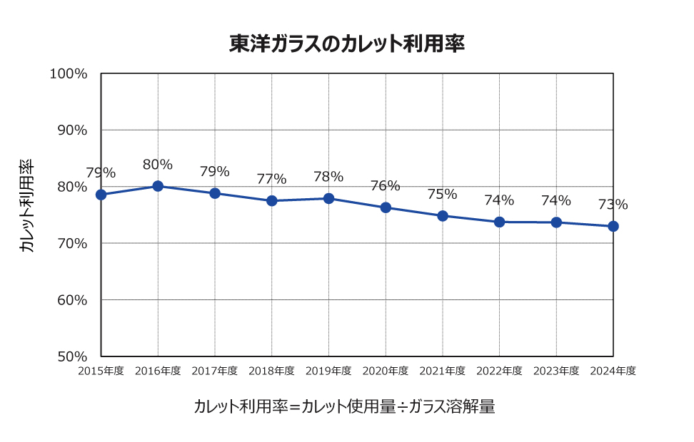 2024年度の東洋ガラスにおける カレット利用率(総溶解量に対する再生原料カレット使用量の割合)は73%でした。
