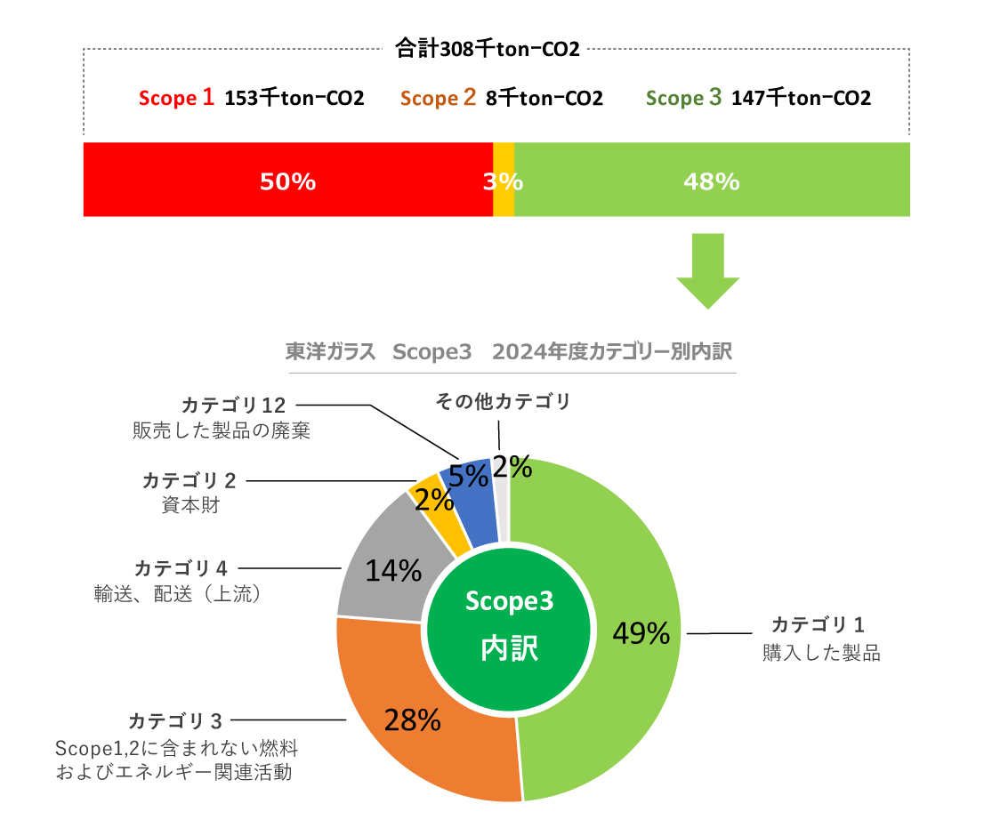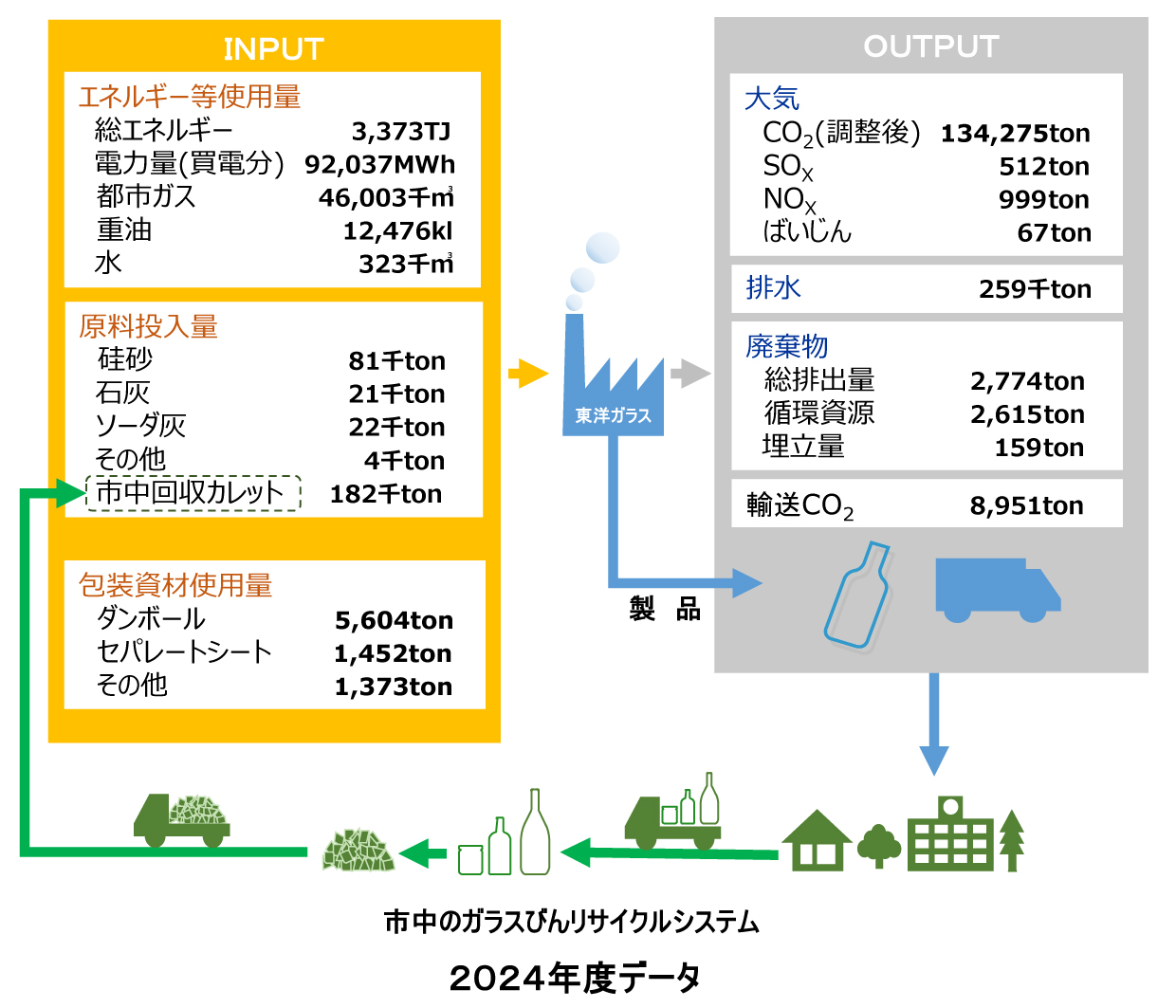 東洋ガラス2024年度(2024年4月1日~2025年3月31日)のマテリアルフロー、および環境負荷は以下のとおりです。
