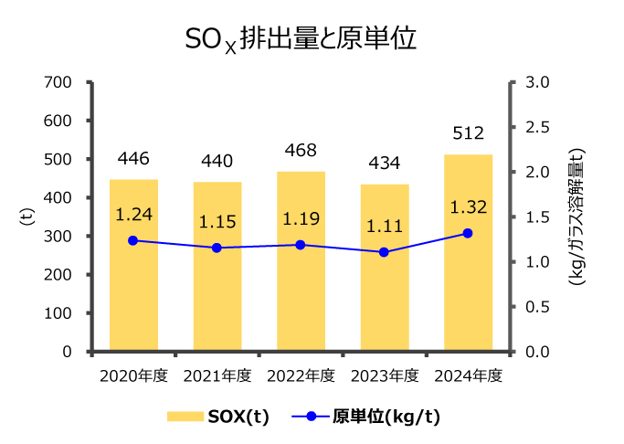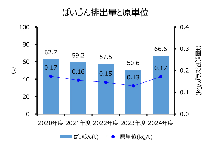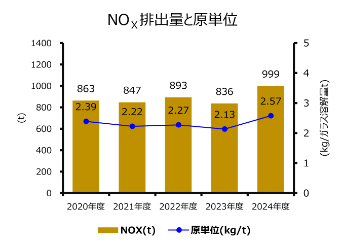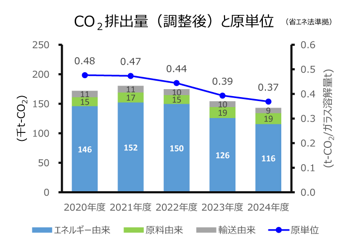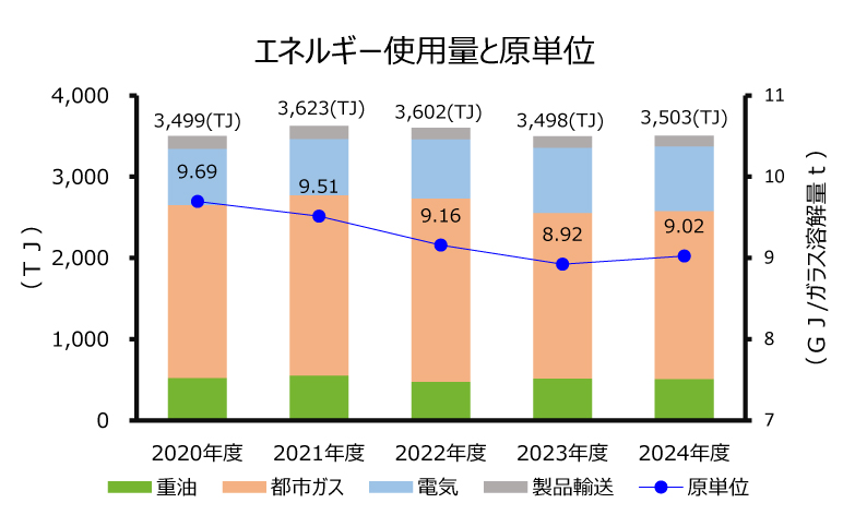エネルギー原単位(ガラス1トンを溶解するために必要なエネルギー使用量)は、省エネ活動、設備投資、および生産体制の合理化(2012年度)による効果で近年大きく改善しています。これらの活動によりエネルギー消費量の削減のみならず、CO2排出量削減にも寄与できるよう積極的かつ継続的に取り組んでまいります。